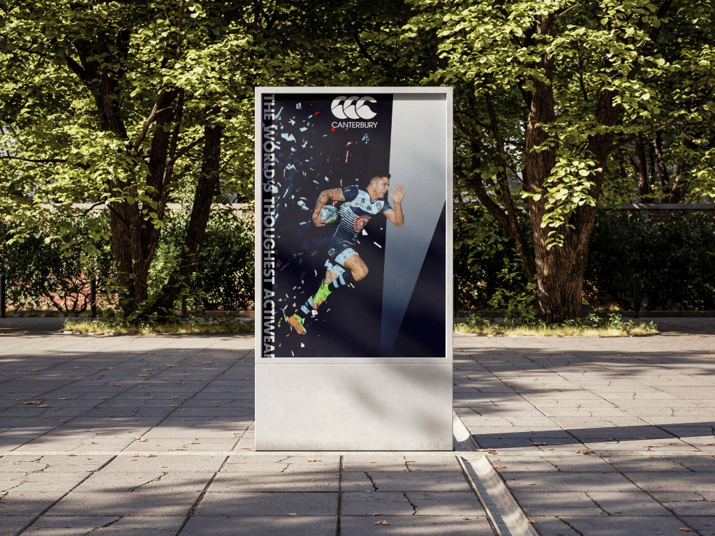 Pour donner vie à ce projet, j’ai choisi de m’inspirer de la marque de vêtements de sport Canterbury, connue pour son slogan : « The World’s Toughest Activewear« . Afin de renforcer cette promesse de robustesse, j’ai décidé de l’associer au rugby, un sport où la marque est bien implantée et dont les valeurs de force et de résilience mettent en lumière le message de Canterbury.